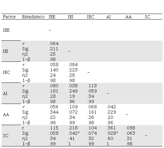 Para realizar el análisis inferencial, la prueba de Kolmogorov-Smirnov de significancia asintótica bilateral con corrección de Lilliefors mostró un ajuste de distribución normal en todos los factores de la Escala (IEE:│Dmax│= 0.139, p>0.05; IEI:│Dmax│= 0.154, p>0.05; IEC: Dmax│= 0.110, p>0.05; AI: │Dmax│= 0.098, p>0.05; AA:│Dmax│= 0.059, p>0.05; SC: │Dmax│= 0.105, p>0.05), además de la prueba de Levene (p = 0.228, p>0.05) para igualdad de varianzas. Lo que admitió el factor de normalidad para computar los análisis ANOVA entre los resultados obtenidos.