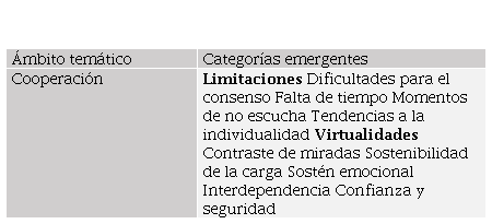 Una vez recogidos los datos se procedió a interpretar de manera contrastada y bajo una perspectiva hermenéutica (Habermas, 1986) las diferentes voces y observaciones, unidas a una extensa revisión documental de diarios y tareas (portafolio) de las alumnas participantes. La información obtenida a través de los instrumentos presentados fue categorizada desde un enfoque apriorístico (Cisterna, 2005) en base a varios ámbitos temáticos (uno de ellos se correspondía con el análisis cooperativo del caso). A su vez, cada uno de estos ámbitos se fueron dividiendo en una serie de categorías emergentes, o como Elliot (1990) denota, datos sensibles, tal y como se muestran en la Tabla 2.