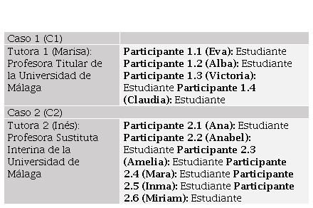 La muestra de esta investigación está compuesta por 10 estudiantes de maestras y sus 2 tutoras académicas que, a su vez, se subdividen en dos grupos cooperativos que desarrollan Lesson Study. El caso 1 (C1) está compuesto por la Tutora 1 y su grupo de 4 estudiantes de maestra; y el caso 2 (C2) está compuesto por la Tutora 2 y su grupo de 6 estudiantes. Todas las estudiantes cursaban el cuarto curso de Educación Infantil. La tabla 3 sintetiza la naturaleza de dicha muestra.
