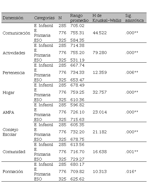 A través del estadístico inferencial de Kruskal-Wallis, en la Tabla 1 se muestran los datos de significación respecto a las dimensiones de participación de las familias en la escuela en función de la etapa educativa en la que están matriculados sus hijos/as. En todas las dimensiones se obtiene un valor de significación máximo (p=.000) a excepción de la formación (p=.016) aunque también se encuentra dentro del nivel de significación mínimo (p=.050).