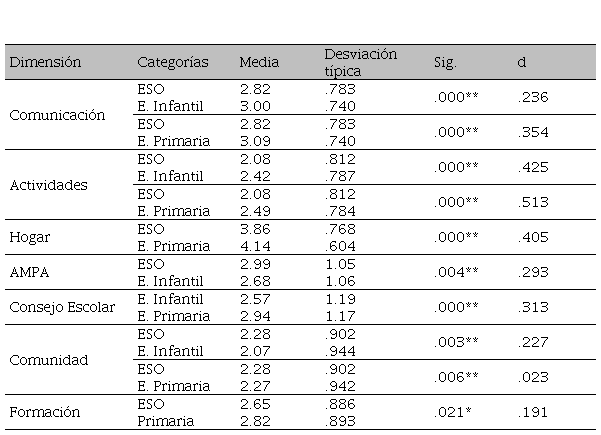 Posteriormente, con la finalidad de esclarecer los cruces de significación, se aplicó el test de Bonferroni de comparaciones múltiples que determinó que las familias con hijos/as en Educación Secundaria tienen una menor comunicación e implicación en las actividades y en la formación de centro que las familias con hijos/as en Educación Primaria y Educación Infantil. Al igual que el papel en el hogar respecto a la educación de los menores es superior en las familias de Educación Primaria frente a los de Secundaria. Sin embargo, estos tienen un mayor sentimiento de comunidad e implicación en el AMPA que las familias de Educación Infantil y Educación Primaria. Por último, el papel de los progenitores en el Consejo Escolar es mayor en los progenitores con menores en Primaria que en Infantil. Respecto al tamaño del efecto, cabe mencionar, dado que superan el valor típico establecido (d=.050), el cruce entre Secundaria y Primaria respecto a la involucración en las actividades (d=.513), mostrando una fuerza de asociación moderada.
