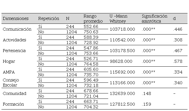 OE2: Conocer si se hallan diferencias significativas en las dimensiones de participación de las familias rurales en la escuela en función de la repetición o no del alumnado.