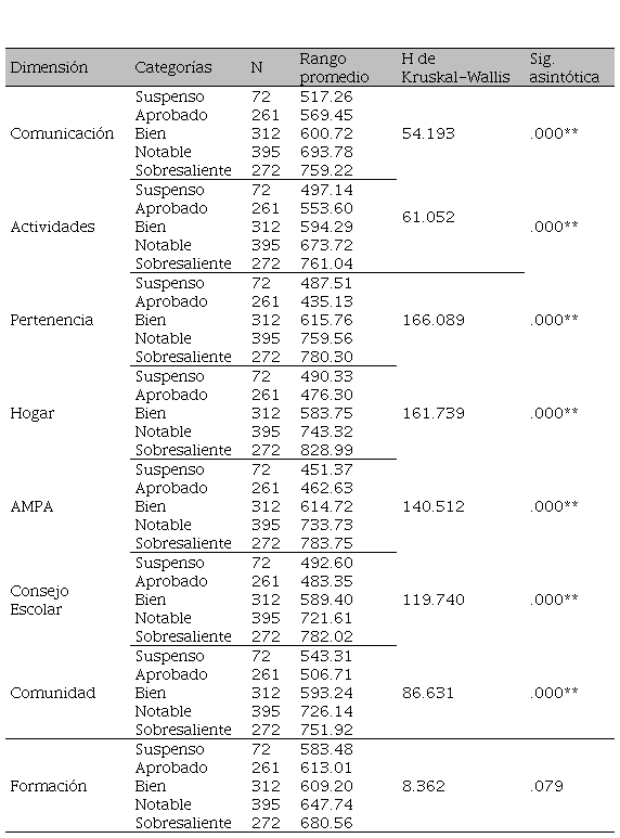 Por último, se abordan los datos obtenidos en relación a la variable del rendimiento académico a partir del uso del estadístico Kruskal-Wallis para verificar la inferencia de esta en las dimensiones de participación familiar contempladas. Únicamente ha quedado patente que la participación en la formación (p=.079) no se ve condicionada por el rendimiento académico de los menores. Por el contrario, en el resto de las dimensiones, se obtiene el valor de significación máximo (p=.000) en relación al ámbito académico, esclareciendo que es una variable de consideración respecto a la participación familiar en los centros escolares.