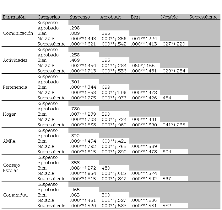 Por último, los cruces de significatividad entre las categorías del rendimiento académico y las dimensiones de participación familiar muestran que en todas ellas se identifica un importante componente de significación entre las familias con alumnos de suspenso, aprobado o bien en comparación con los de notable y sobresaliente (p< .050), siempre a favor de aquellos que tienen hijos/as con mejor rendimiento académico. También se aprecia cruce de significación entre las familias con hijos/as de calificación de bien y los de suspenso en las dimensiones de pertenencia, hogar, AMPA y Consejo Escolar, a favor de aquellos de mejor rendimiento académico. Además, aunque con un componente de significación menor, también hay diferencia de medias entre los hijos/as de notable y sobresaliente en las dimensiones de comunicación, actividades y hogar, a favor de los últimos. En relación al tamaño del efecto se obtiene un valor superior al típico (d=,50) en el cruce entre suspenso y sobresaliente y el de aprobado y sobresaliente en todas las dimensiones, verificando la importante magnitud de las relaciones de significación. Entre suspenso y notable se halla un tamaño del efecto considerable en las dimensiones de pertenencia (d=.858), hogar (d=.708), AMPA (d=.792) y Consejo Escolar (d=.654), al igual que entre aprobado y notable en las dimensiones de pertenencia (d=1.06), hogar (d=.724), AMPA (d=.765), Consejo Escolar (d= .682) y comunidad (d=.527). Por último, se destaca la relación de bien y sobresaliente en las dimensiones de hogar (d=.690) y Consejo Escolar (d=.542). Se pone de manifiesto así la importante significatividad que existe en la participación parental, siendo significativamente mayor cuando el hijo obtiene unos mejores resultados escolares