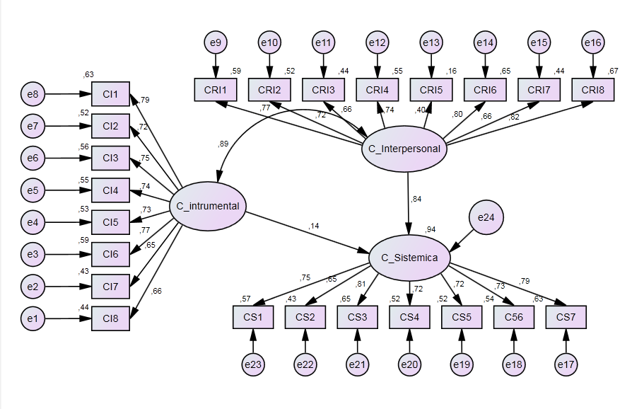La alta correlación positiva entre las competencias instrumental e interpersonal de .89, indica que a mayor desarrollo de competencias instrumentales mejores serán las relaciones interpersonales. El factor de competencias interpersonales presenta una relación causal directa significativa con efecto sobre las competencias de tipo sistémico de .84. Adicionalmente, se evidencia una débil correlación significativa entre el factor de competencia instrumental como factor incidente en la competencia sistémica con .14.