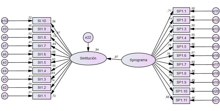Al establecer la influencia de la satisfacción del programa en relación con la satisfacción de la institución, se construye el modelo de ecuaciones estructurales SEM; se plantea que la variable latente denominada satisfacción del programa (Sprograma) causa un efecto en la variable latente satisfacción de la institución (Sinstitución) y, a su vez, causa efectos a las 21 variables observables exógenas (independientes) codificadas en la tabla 6.