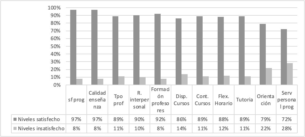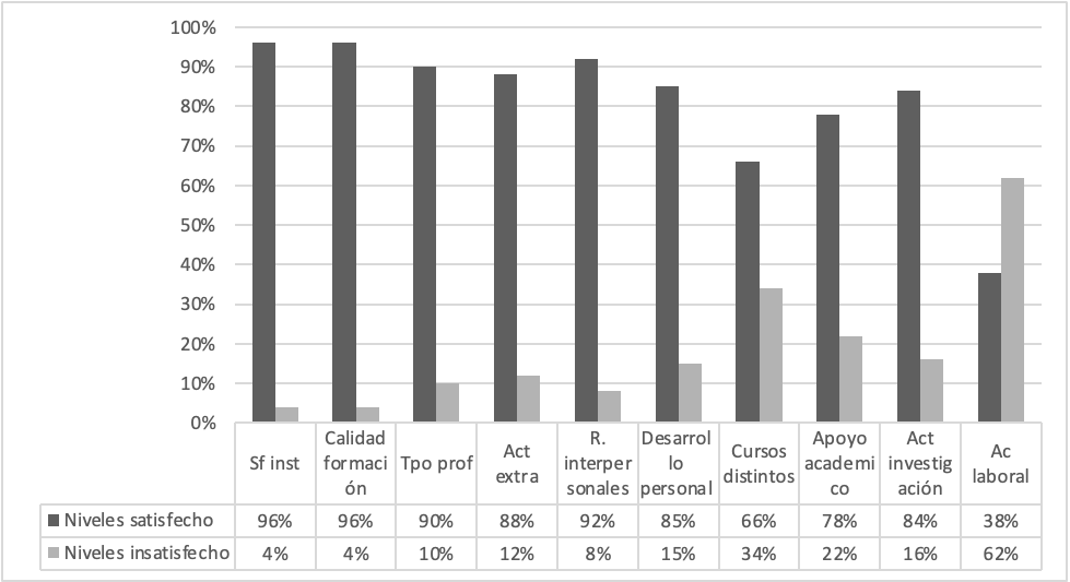 De forma descriptiva, en la figura 4, se observa un panorama favorable predominante. Es decir, se revelan niveles de satisfacción altos, en todos los aspectos evaluados como son: los institucionales, calidad de la formación y de los profesores, actividades extracurriculares, relaciones interpersonales, desarrollo personal, actividades de investigación, actividades laborales y apoyo académico.