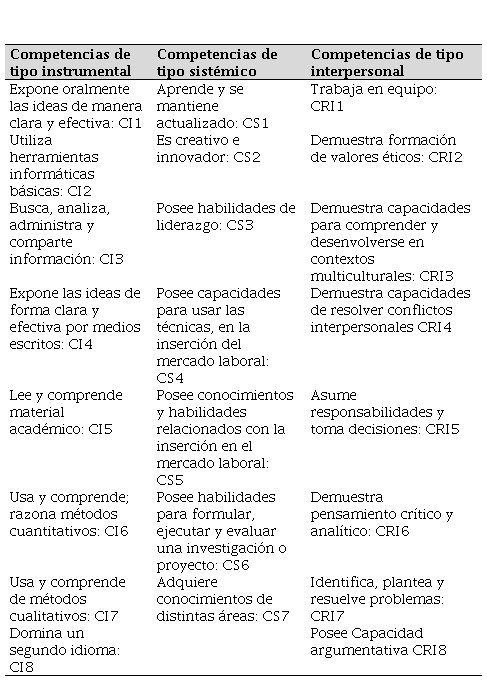 En detalle, se derivan tres factores latentes identificados con los nombres: competencias de tipo instrumental, competencias de tipo sistémico y competencias de tipo interpersonal.
