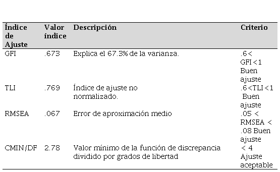 Los estadísticos confirmatorios según Ruiz et al., (2010), cumplen con parámetros óptimos para el buen ajuste con indicadores: CMIN/DF, de 2.06 que, como se especificó anteriormente, es menor a 4; GFI de .75, es un índice de ajuste no normalizado de .85, cercanos a 1; con RMSEA de .05 error de aproximación medio por grado de libertad.