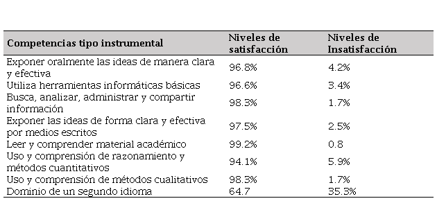 Respecto a las competencias de prototipo instrumental, se observa en la tabal 4, que la mayoría de los graduados manifiestan una percepción favoreable, evaluada entre satisfecho y muy satisfecho, con valores superiores al 90%, a excepción de la variable asociada con el dominio de un segundo idioma, para la que - aunque la mayoría de graduados está satisfecha con esta competencia, con un 64.7% -, existe un porcentaje considerable, de 35.3%, en valores asociados a un rango de valor entre insatisfecho y muy insatisfecho.