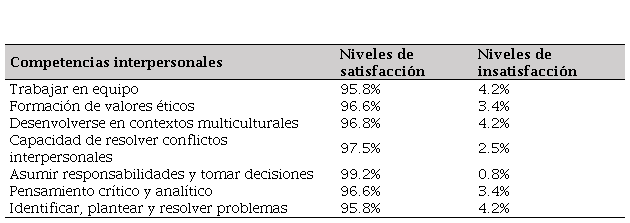 De manera descriptiva las tablas 3, 4 y 5, muestran aspectos relacionados con la opinión del graduado sobre las competencias adquiridas en la vida académica, expresadas en cuatro niveles de satisfacción, según la encuesta, desde muy bajo, bajo, medio y alto; clasificadas en dos categorías a saber: satisfecho (categorías alto y medio) e insatisfecho (categorías bajo y muy bajo), asociadas a las competencias generales de tipo instrumental, interpersonal y sistémico.