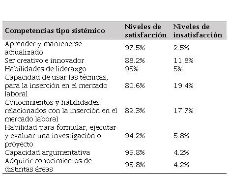 La tabla 5, muestra competencias sistémicas con porcentajes que superan el 80%, dentro de las cuales se destacan, por sus valores más altos, la capacidad de aprender y mantenerse actualizado (97.5%), capacidad argumentativa (95.8%), y con igual porcentaje, la capacidad de adquirir conocimientos de distintas áreas.