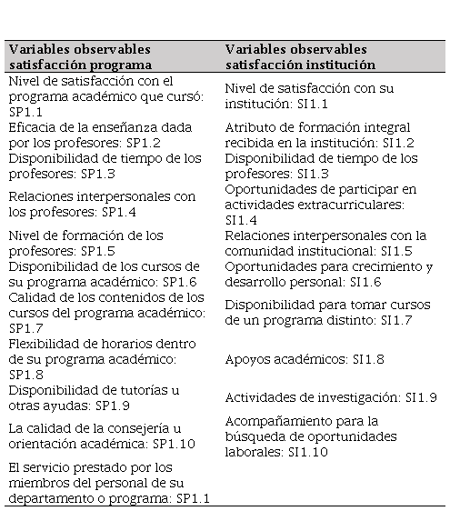 En forma análoga al análisis anterior, se procesa la información que describen las variables observables asociadas a la satisfacción del programa y de la institución (variables latentes), como se lista en la tabla 6, las cuales constituyen los elementos que influyen en la formación del graduado.