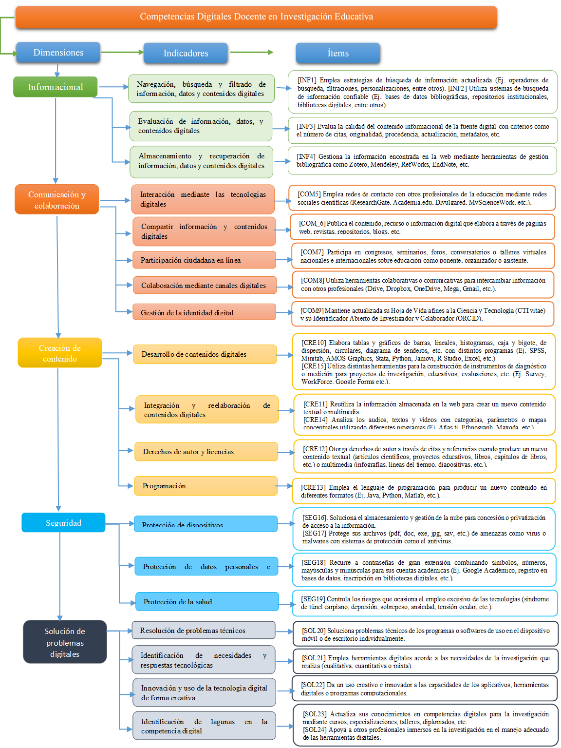 Inicialmente, se revisó la bibliografía de las publicaciones más recientes sobre diseños de instrumentos para evaluar las competencias digitales de los profesores, las publicaciones fueron entre el 2015 y 2021. El proceso de revisión fue en los idiomas de inglés y español considerando los términos de búsqueda “Digital competence” OR “Digital literacy” AND “teacher” OR “professor”. Seguidamente, se confirmó que la principal base de elaboración de instrumentos son los aportes brindados por el Instituto Nacional de Tecnologías Educativas y de Formación del Profesorado (2017). De este modo, el instrumento se elaboró con 24 ítems que se agruparon en 5 dimensiones: informacional (4 ítems), comunicación y colaboración (5 ítems), creación de contenido (6 ítems), seguridad (4 ítems) y solución de problemas digitales (5 ítems). Por cada ítem, los participantes respondieron a una escala de 1 al 5, donde 1=nunca, 2 = casi nunca, 3 = a veces, 4 = casi siempre y 5 = siempre. Se nominalizó al instrumento como “Cuestionario de Competencias Digitales Docente en Investigación Educativa” (CCDD-IE-24). La valoración se atribuye únicamente desde la percepción del profesorado. Su estructura se evidencia en la figura 1.
