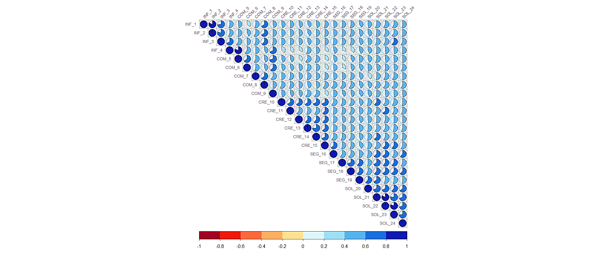 Las relaciones policóricas entre los ítems oscilan entre .35 y .9, lo que indica correlaciones significativas y moderadas (figura 2). Solo las relaciones entre el ítem 4 con el 12, 15 y 17, así como el ítem 15 con el 5 y el ítem 6 con el 17 fueron inferiores a .4. El resto superó esta puntuación y devela relaciones adecuadas, que llevan a la decisión de asumir una rotación oblicua (oblimin directo).
