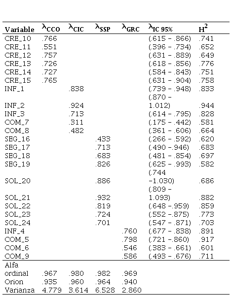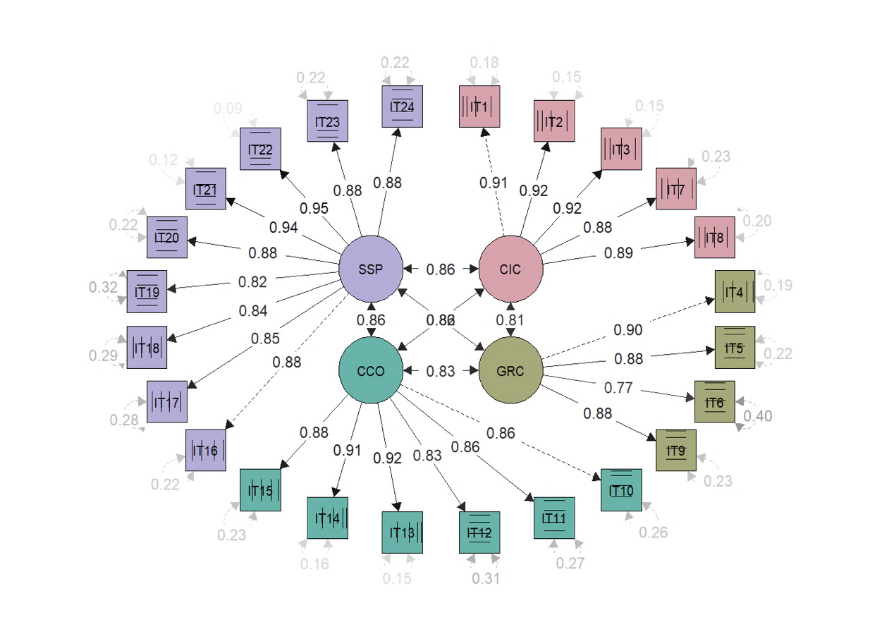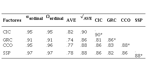 Los índices de consistencia interna del instrumento de acuerdo a los factores CIC, GRC, CCO y SSP alcanzaron puntuaciones altas mayores a .9 en el αordinal y Ωordinal (Tabla 4). Además, la validez convergente de cada variable latente también presentó puntuaciones óptimas (AVE > .5). En cuanto a la validez discriminante, se evidenció que las puntuaciones del √AVE son superiores a las correlaciones entre los factores, por tanto, se confirma que existe una identidad de cada factor respecto a otros