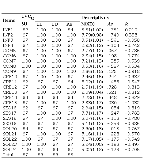 Los resultados de la validez de contenido con el Coeficiente de Hernández-Nieto brindaron valores > .7 en la suficiencia (> .92), claridad (> .94), coherencia (> .94) y relevancia (> .94) en todos los ítems (tabla 1). En cuanto a los estadísticos descriptivos, evidencian una media entre 2.09 y 3.81, con desviaciones entre 1.02 y 1.18, que develan valores aceptables por encontrarse entre 3 y 1. En el caso de la asimetría (As) y curtosis (K) los ítems obtuvieron puntuaciones entre +/- 1.5, lo que indica la adecuación de los ítems (Forero et al., 2009).