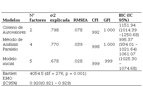 La prueba de KMO indica una puntuación superior a .50, que devela una adecuación de la muestra. Asimismo, la prueba de Bartlett es menor a .05, esto indica que existe una matriz de identidad y se puede ejecutar el AFE. Además, se compara los tres modelos con 2, 4 y 5 factores. El modelo con 2 factores parece explicar en mayor proporción la varianza (79.8 %), respecto al modelo con 4 (77 %) y 5 factores (67.8 %), sin embargo, los tres modelos superan el 50 %. En el RMSEA y CFI, se evidencia mejor adecuación con el modelo de 5 factores, sin embargo, en el GFI fue mejor el modelo con 4 y 2 factores (tabla 2). El criterio de parsimonia BIC indica que es más parsimonioso el modelo con 4 factores, motivo por el que constituye el más pertinente y adecuado para el presente estudio (Hair et al., 2010).