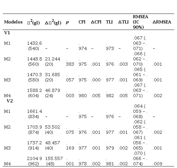 Para conocer el grado de la invarianza de medición, se realizó el análisis multigrupo con base en las variables sexo (V1) y nivel de enseñanza (V2) del CCDD-IE-24. El modelado incluye la estructura media para los modelos de invarianza configuracional (M1), métrico (M2), escalar (M3) y estricto (M4). Primero, se probó el M1 (modelo configuracional) de línea base con un modelo de 4 factores latentes sin restricciones, en el que se encontró ajustes adecuados como el RMSEA < .08, CFI > .95, TLI > .95 (Hu & Bentler, 1999). Seguidamente, en el M2 se analiza la invarianza métrica con restricciones sobre las cargas factoriales en V1 y V2, en el que los ajustes también fueron pertinentes. La diferencia entre M2 y M1 evidencia valores con diferencia mínima entre los ajustes en ΔCFI < .01, ΔTLI ≤ .01, ΔRMSEA ≤ .015 y p > .05, por tanto, las cargas factoriales son equivalentes (Chen, 2007). En la invarianza escalar (M3) se ha restringido los interceptos y las cargas. Los índices obtenidos fueron apropiados y al compararlo con el M2, no se presentaron cambios significativos superiores a los criterios establecidos en ninguna variable (V1 y V2). Finalmente, en la invarianza estricta (M4), en el que se restringió además de las cargas e interceptos, los residuos o las varianzas de error, se detectó que, aunque los índices de ajuste y las diferencias con el M3 expresan valores adecuados en Δ de CFI, Δ de TLI y Δ de RMSEA, el valor de ꭓ2 obtenido (p < .05), resultó significativo, contrariamente a lo esperado en la V1 y V2. Por lo tanto, los resultados sostienen el buen ajuste de los reactivos en el modelo de 4 factores del CCDD-IE-24 y se mantienen invariantes al sexo y el nivel de enseñanza de los profesores, solo en un parámetro del M4 no se halló el valor esperado, por lo que se asume una invarianza parcial debido a la excesiva restricción de la invarianza estricta (Dimitrov, 2010), pero las puntuaciones son predominantemente comparables entre los grupos.