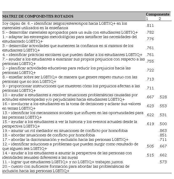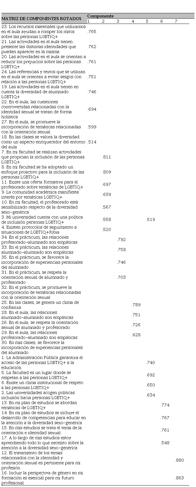 Para la extracción de factores partimos de que la solución factorial explique, al menos, un 50% de la variabilidad total (Tabachnick & Fidell, 2001), considerando la matriz adicional rotada apuntada en la tabla 2.