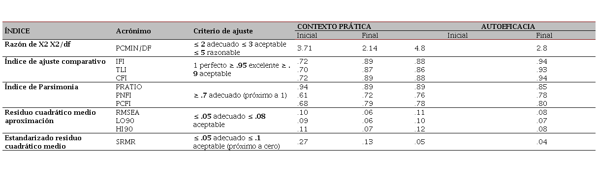Por su parte, el Análisis Factorial Confirmatorio (AFC), además, viene a corroborar la estructura factorial sugerida por el AFE. Los modelos apuntados en las Figuras así lo evidencian, al igual que los datos de la Tabla 4, donde se presentan los datos comparativos del modelo inicial y final, concluyendo que se obtienen unos niveles de ajuste final satisfactorios (Byrne, 2016). De hecho, el PCMIN/DF ya nos apunta una bondad de ajuste aceptable, por debajo de 3 (Kline, 2016). Los índices de ajuste incremental (IFI, TLI y CFI) son aceptables en torno a .90 (Byrne, 2016; Whittaker, 2012) en Contexto de Práctica y superiores a .90 en Autoeficacia DSG. Respecto a los residuos, se obtienen valores inferiores a .08 (Kline, 2016; Whittaker, 2016), con un RMSEA general aceptable con valores inferiores a .08 y el SRMR también es aceptable con valores inferiores .08. Asimismo, los índices de parsimonia son elevados (PRATIO, PNFI y PCFI), superiores a .07 y próximos a 1 (Ho, 2006).