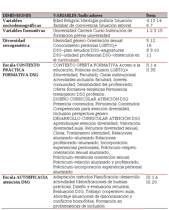 El Cuestionario Autoevaluación del contexto de práctica y autoeficacia del alumnado universitario de educación hacia la inclusión de personas LGBTIQ+ se estructura, además de 12 ítems de variables sociodemográficas y formativas y 4 preguntas abiertas, en dos grandes dimensiones: contexto de prácticas formativas para la atención de la DSG (35 ítems) y nivel de autoeficacia para la atención DSG (20 ítems). Para ello, se consideran como base (Tejada et al., 2025a), además de la fundamentación general apuntada, otros estudios e instrumentos específicos sobre las dimensiones implicadas, variables e indicadores (Tabla 1): CONTEXTO DE PRÁCTICAS FORMATIVAS en educación superior (Enfoques de los maestros en formación sobre diversidad de género, Bochicchio et al., 2019; Estudiantes de educación superior y diversidad sexual, Espinoza, 2020; Escala de Evaluación Sensible a la formación en Igualdad de Género ESFIG, Miralles et al., 2020; Self-Assessment Rubric for the Institutionalization of Diversity, Equity and Inclusion in Higher Education, NERCHE, 2016; Cuestionario de Formación del Profesorado en la diversidad afectivosexual, Penna, 2012; Escala de Creencias, actitudes y prácticas de atención a la diversidad para docentes universitarios, Ramos Santana et al., 2021; La formación del profesorado de Educación Primaria en diversidad sexogenérica, Sánchez Torrejón, 2021; Comportamientos de profesores frente a la comunidad LGTBI, Toro et al., 2020) y AUTOEFICACIA ATENCIÓN DSG (Escala autoeficacia sobre el trabajo con y para estudiantes LGBTQ, Brant, 2017; Core Self Evaluations Scale,Carroll, 2019; The Teacher Self-Efficacy Scale LGBTQ, Jones et al., 2021; Cuestionario para la evaluación de competencias del profesorado en atención a la diversidad CECPAD, Mena Ramos & García Sanz, 2017).