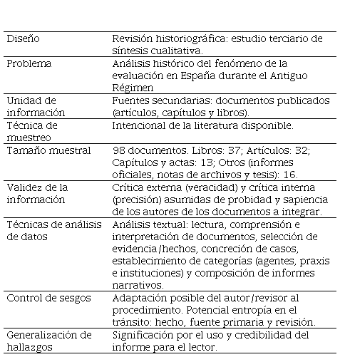 Este estudio es pues una revisión historiográfica, en la que se trabaja con fuentes secundarias, pero realizada dentro del campo de la evaluación educativa, circunscrita a un contexto espacial (España), en un periodo temporal bien acotado (Antiguo Régimen) y en un tópico como la evaluación educativa. Como estudio de síntesis revisional y evaluativo se opera con una metodología cualitativa a la búsqueda de casos o agentes, entes institucionales y prácticas evaluativos como categorías inferidas; teniendo en cuenta que las críticas a sus fuentes, interna (credibilidad) y externa (veracidad), se asumen como dadas según la sapiencia y probidad de los autores de tales fuentes. Otra amenaza a la validez de toda revisión es que ésta quede diluida en una sarta de evidencia inconexas, aunque, en última instancia, el lector deberá juzgar. La preocupación de conseguir que lo escrito (fuentes) devenga en texto (el que el lector lee ahora) es un ejercicio propio de una hermenéutica, aquí elemental mas no por ello irrelevante, pero autocomprensiva, al menos para el que infiere, éste que escribe, y espero que para el lector; aunque, siguiendo a Ricoeur (2001, p. 33), ninguna de las subjetividades, aquí la de tres agentes (autor, revisador-inferidor y lector), tenga prioridad.