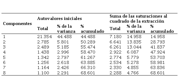 Una vez efectuada la rotación, en la tabla 5 se muestra que no se producen cambios, siendo en ambos casos de 68.601%; sin embargo, sí se producen cambios en cada uno de los factores.