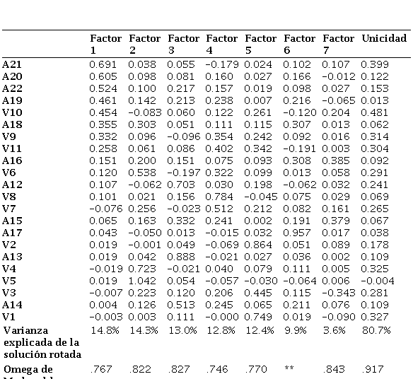 Asimismo, los factores derivados del análisis factorial exploratorio presentaron, en su mayoría (ver última fila de la tabla 1) niveles adecuados de consistencia interna, con coeficientes omega comprendidos entre .74 y .83, lo que resulta aceptable en el contexto de un análisis exploratorio. En el caso de los factores compuestos por un número reducido de ítems, los valores de fiabilidad deben interpretarse con cautela, y en particular, no se estimó la consistencia interna del factor 6, definido por un único ítem, dado que este tipo de coeficientes no resulta interpretable en escalas unidimensionales.