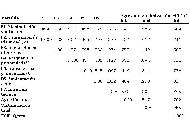Los factores identificados presentan correlaciones de magnitud moderada, lo que respalda el uso de una rotación oblicua y sugiere la existencia de relaciones conceptuales entre las distintas manifestaciones del ciberacoso, sin que ello implique solapamientos completos entre dimensiones (véase tabla 2).