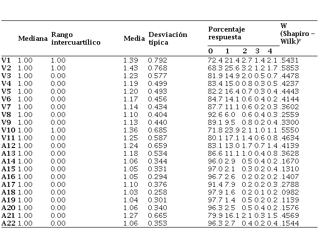 En la tabla 3 se presentan los estadísticos descriptivos de los ítems del ECIP-Q. Se puede observar que, en todos ellos, la mayoría de los participantes eligen la primera y segunda opción de la escala de respuesta, y que el valor de la mediana fue 1 para todas las variables. Además, las distribuciones mostraron desviaciones de normalidad (Shapiro–Wilk p < .001), por lo que se priorizaron estadísticos robustos y pruebas no paramétricas.