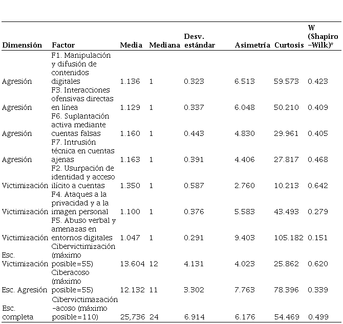 Posteriormente, se llevaron a cabo análisis descriptivos para estimar la prevalencia del ciberacoso, considerando los roles de victimización, agresión y la coexistencia de ambos. Dado el carácter ordinal de las variables y la ausencia de normalidad en varias distribuciones, se priorizó el uso de medidas robustas de tendencia central y dispersión.