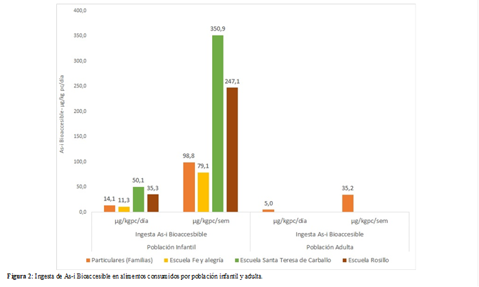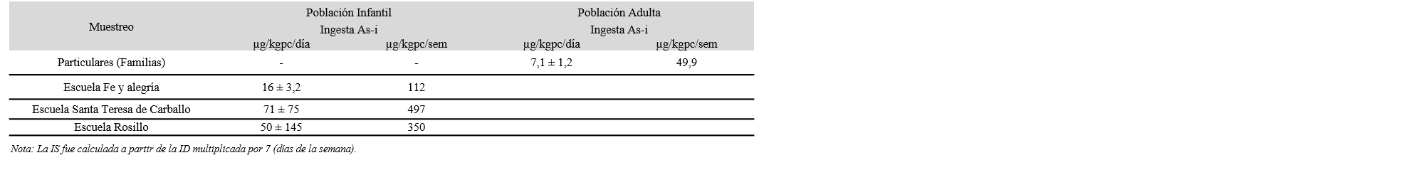 La ingesta diaria de arsénico inorgánico en la población infantil oscilaron entre 675 a 2425 µg.g-1, valores muy superiores a los citados por otros autores, tales como el rango 584 a 733 µg.g-1 descripto por Arain et al. (2009).