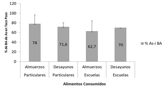 La figura 1 presenta los resultados indicados en la tabla 1 reordenados en población adulta e infantil, mostrando que los porcentajes de bioaccesibilidad de arsénico inorgánico es mayor en los alimentos recolectados en casas de familias.