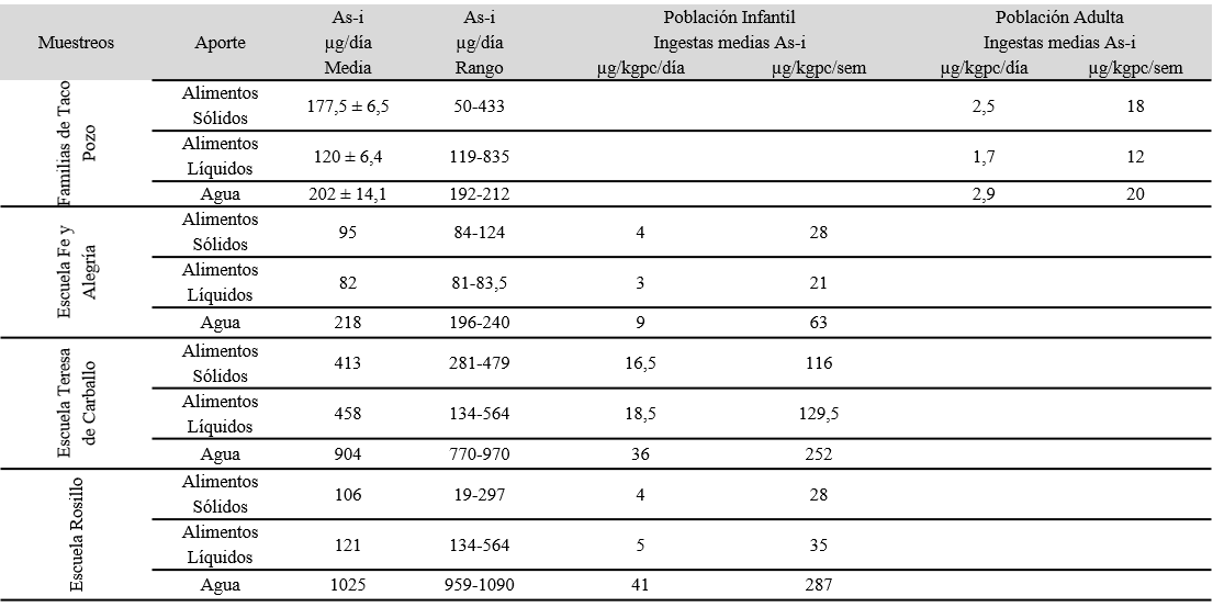 A continuación se describen las ingestas diarias de arsénico inorgánico. Los cálculos de ingestas se realizaron tanto a la población adulta como a la infantil. En la tabla 2 se indican las ingestas diarias de arsénico inorgánico, expresados en µg/día, en cada uno de los lugares de muestreo, considerando el consumo de alimentos sólidos, alimentos líquidos y el agua de bebida. El cálculo de ingesta para la población adulta considera los contenidos de Arsénico en los alimentos recogidos en la Familia, mientras que los contenidos en los alimentos de las escuelas se utilizan para el cálculo de la población infantil. Cada una de estas poblaciones consume alimentos diferentes en cada una de las porciones diarias. Para ambas poblaciones se expresa la ingesta diaria en [µg/Kg peso corporal (pc)] y [µg/Kg peso corporal x 7] para la ingesta semanal.