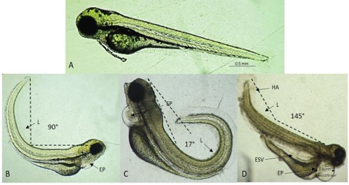 Los embriones de pez cebra (Danio rerio) expuestos a 0,48µg/ml de tiametoxam presentaron alteraciones morfológicas, que se empezaron a evidenciar en el proceso de eclosión del embrión, aproximadamente entre las 72 y 120 h, encontrándose: lordosis leve con un ángulo de 90° y 145°, lordosis severa con ángulo de 17°, edema pericárdico, lordosis media, edema del saco vitelino e hipertrofia de la aleta caudal (Figura 1). En la figura 1D, se observa el área del edema pericárdico que fue de 0,075 mm2.