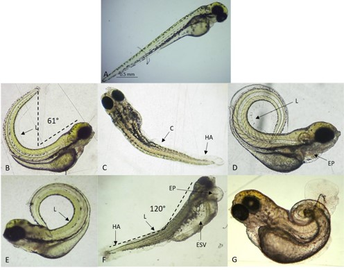 Los embriones de pez cebra (Danio rerio) expuestos a 0,90µg/ml de tiametoxam presentaron mayores alteraciones a nivel óseo, como: lordosis y cifosis (Figura 2), hipertrofia en aleta caudal (Figuras 2C) y enrollamiento total del cuerpo (Figura 2G). Igualmente se encontraron alteraciones a nivel cardiaco como edema pericárdico (Figuras 2D y 2F) y edema del saco vitelino (Figura 2F).