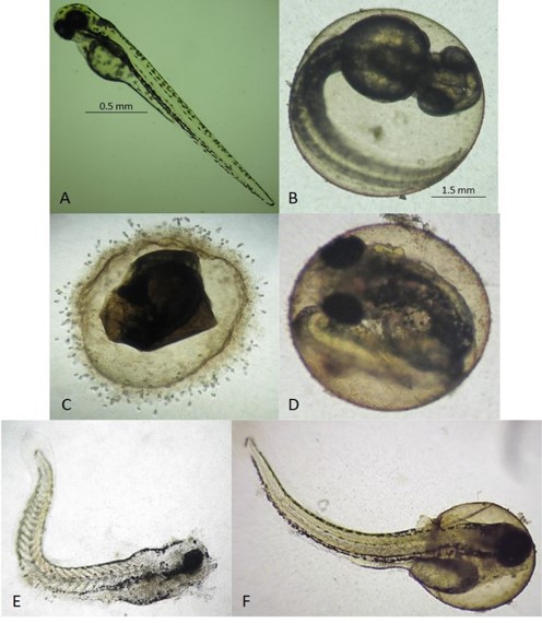 Se realizó una evaluación de huevos de pez cebra y se removieron los huevos no fertilizados, muertos o con presencia de hongo, para evitar daños en el proceso. Los huevos fertilizados con 10 hpf (horas post fertilización), se ubicaron en cajas Petri con las diferentes concentraciones anteriormente mencionadas realizando una renovación diaria de soluciones para mantener las concentraciones apropiadas. La exposición de insecticida se evaluó hasta las 144 horas (6 días aproximadamente). La observación del desarrollo de pez cebra se realizó directamente en la caja Petri usando para ello un microscopio óptico con cámara digital marca Zeiss, se realizó una descripción y un registro fotográfico de las alteraciones encontradas en huevos y larvas.