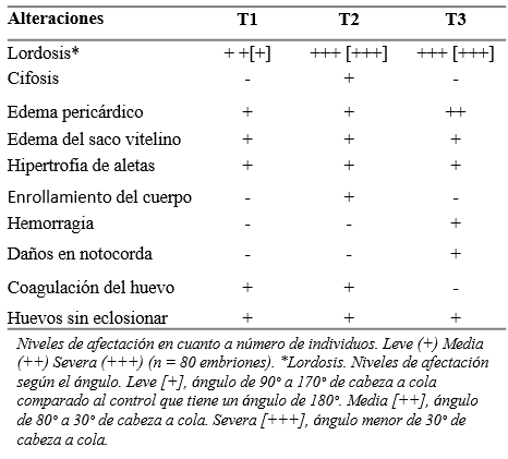 Para el caso de edema pericárdico el tratamiento 1,30µg/ml presentó un nivel de afectación medio, más del 40% de los individuos mostraron este tipo de alteración, mientras que en los otros dos tratamientos los niveles de afectación fueron leves, menos de 40% de los individuos. En otras alteraciones como cifosis, edema del saco vitelino, hipertrofia de aletas, enrollamiento del cuerpo, hemorragia, daños en notocorda, coagulación del huevo y huevos sin eclosionar se presentaron de forma leve en los tratamientos, es decir menos del 40% de los individuos registraron estos tipos de alteraciones.