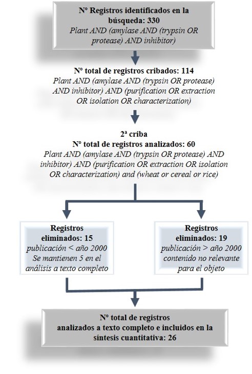 Se realizó una búsqueda sistemática de la literatura científica existente relacionada con los ATIs de cereales. Para la revisión se consideró artículos desde el año 2000, utilizando bases de datos documentales de revistas indexadas como Medline, Scielo, Science Direct y Scopus, con el diagrama de flujo y criterios de búsqueda según se muestra en la figura 2. Finalmente se utilizaron 26 artículos para esta revisión bibliográfica.