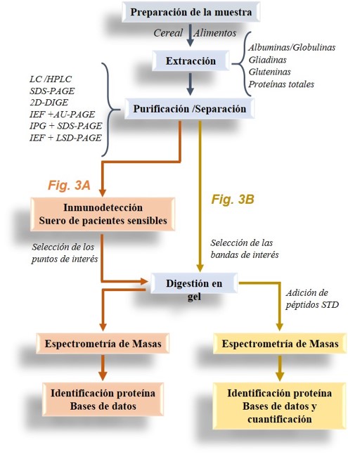 En esta revisión se distinguen dos estrategias de análisis mediante MS (figura 3), una identifica los ATIs con potencial alergénico por inmunotransferencia, se aíslan y posteriormente se caracterizan por MS (Pastorello et al., 2007; Akagawa et al., 2007; Šotkovský et al., 2011; Lang et al., 2013; Goliáš et al., 2013), la otra estrategia identifica y cuantifica los péptidos característicos resultado de la digestión de las proteínas por técnicas de MS (Fontanini et al., 2007; Prandi et al., 2013; Uvackova et al., 2013; Flodrová et al., 2015; Satoh et al., 2016).