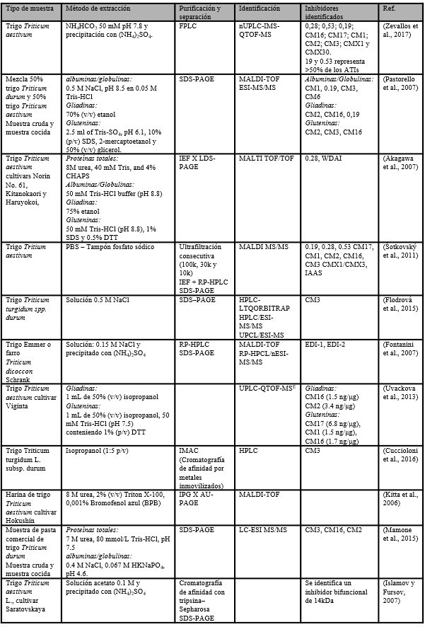 El objetivo de este trabajo fue realizar una revisión de las técnicas más recientes de extracción, purificación, detección y cuantificación de los ATIs mediante espectrometría de masas (MS) principalmente del trigo y de otros cereales tanto en crudo como en alimentos procesados.