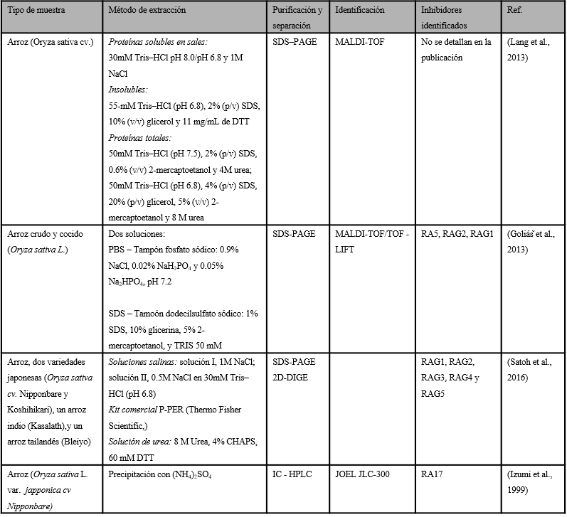 Otro trabajo estudió la solución más eficaz para la extracción de alérgenos del arroz, concluyendo que los ATIs se encuentran mayoritariamente en la fracción de albúminas/globulinas y que la mayor concentración se obtiene con la solución compuesta de NaCl 1M en Tris–HCl 30mM a pH 8.0 o pH 6.8 (Akagawa et al., 2007). La identificación mejor de los alérgenos del arroz sobre las proteínas totales fueron las basadas en una mezcla de Tris–HCl, SDS, 2-mercaptoetanol y urea porque generaban menores interferencias en la cuantificación.