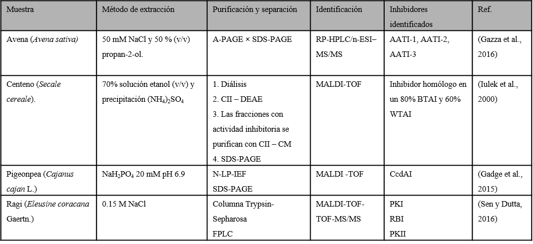 Los primeros inhibidores aislados fueron el inhibidor Kunitz y Bowman-Birk de la soja en 1940 y el inhibidor de la α-amilasa de cereales (Kneen y Sandstedt, 1943; Kunitz, 1945; Bowman, 1946). Desde entonces se han identificado y caracterizado numerosos inhibidores en un amplio espectro de especies vegetales debido principalmente al interés en modificar su expresión para el control de las plagas o para tratar la diabetes y la obesidad (Vasil, 2007; Barrett y Udani, 2011; Dang y Van Damme, 2015). Recientemente se han vinculado los inhibidores de la α-amilasa y la tripsina (ATIs) del trigo y de otros cereales con diversas patologías gastrointestinales, como la Enfermedad Celíaca (EC) y la Sensibilidad al Gluten no Celíaca (SGNC), por ser fuertes activadores de la respuesta del sistema inmune innato (Junker et al. 2012; Zevallos et al., 2017; Reig-Otero et al., 2017).