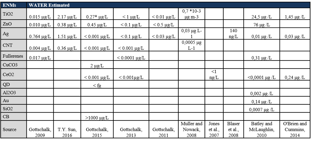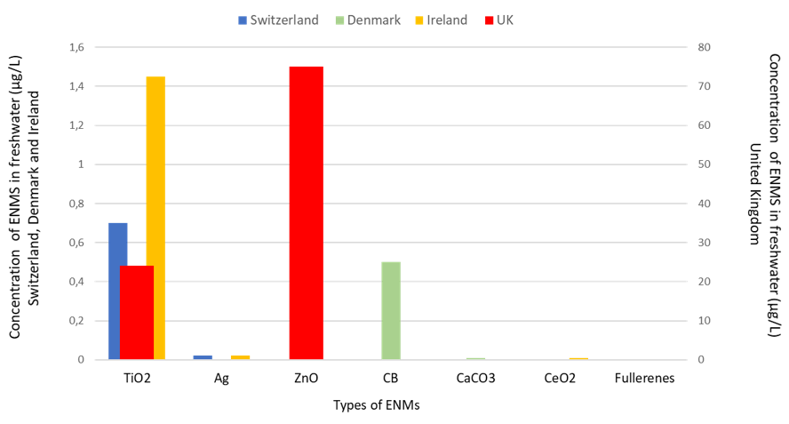 Higher concentrations of ENMs are expected in freshwater ecosystems, where quantities above 76 µg/L were retrieved for ZnO nanoparticles. Moreover, current data exists only for four countries in Europe. From the perspective of nanomaterials, titanium dioxide (TiO2) and silver (Ag) are the most measured compounds. Table 1 and 2 shows data on the concentration levels estimated for water and soil compartment respectively.