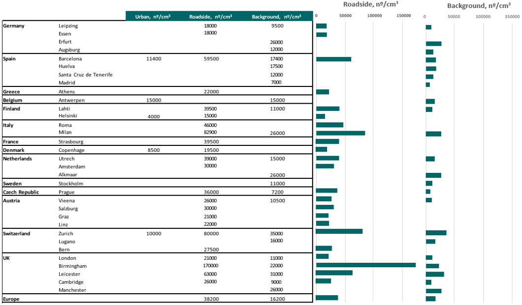 Figure 2 shows data on the concentration of ultrafine particles (1 – 100 nm) for urban atmospheres. In this compartment, there are more available studies, giving information on air quality levels both in cities and the countryside. The data cover most of the countries of the European Union and some of them are summarized in the table above, which shows nanoparticle concentrations in urban areas, roadside and background levels for different cities of Europe. According to these data, Birmingham, Milan, Zurich, Barcelona and Leicester are the cities with the higher concentration of nanoparticles.