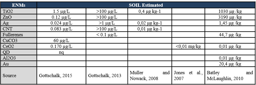 350.000 and 123.000 tons of ENMs to the water and soil compartment respectively, which means concentrations up to 200 μg/L in water and 900 μg/kg in soil. Considering published data, recent studies reported significant concentrations in the environment, with values ranging from 0.003 ng/l (fullerenes) to 21 ng/l (TiO2) for surface waters, and values around 1 ng/kg (fullerenes) to 89 g/kg (TiO2) in sludgetreated soils. Similarly, modelling studies conducted by Gottschalk et al. in 2013 reported concentrations TiO2 in rivers ranging from 3 ng/l to 1.6 mg/l, and Hendren et al. in 2013 reported concentrations of nano-silver in sludge ranging from 4.3 μg/kg to 13.03 μg/kg.