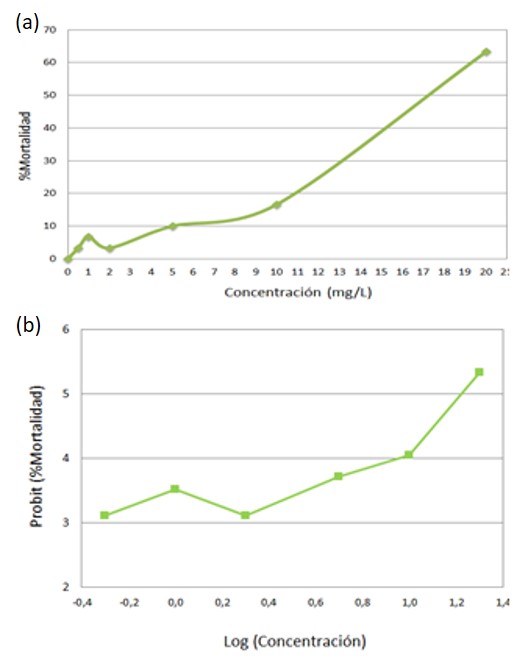 El porcentaje de mortalidad más elevado de nauplios de Artemia ocurrió a la concentración de 20 mgL-1 de ibuprofeno, equivalente al 63.3% de mortalidad, lo que evidencia que si existen efectos de toxicidad aguda con ibuprofeno. Se calculó la concentración de ibuprofeno que produce mortalidad sobre el 50% de los nuaplios de Artemia salina en estado II-III en un periodo de exposición de 24 horas CL 50-24h mediante el análisis probit obteniendo como resultado 17.386 mg L-1. Un resultado similar se obtuvo en un estudio realizado por Kim et al., (2009) quien expuso a un crustáceo de agua dulce a ibuprofeno determinando como concentración letal CL 50-24h 19.59 mg L-1.