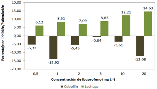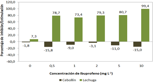 El efecto fitotóxico sobre la radícula e hipocótilo de cebollín fue mayor a las concentraciones de 1 y 20 mgL-1. La inhibición en la elongación de la radícula e hipocótilo fue menor al 50% con respecto al control negativo, por lo que no fue posible calcular la concentración que produce el 50% de inhibición en la radícula e hipocótilo, bajo esta consideración el ibuprofeno a las concentraciones estudiadas no se considera altamente tóxico (Bagur et al., 2011).