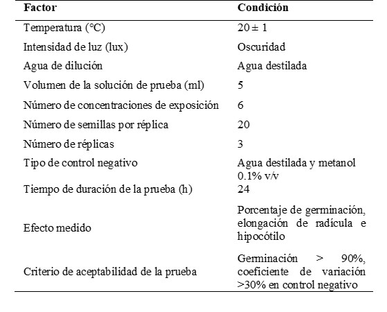 Los ensayos con cada concentración fueron realizados por triplicado. En cada caja Petri de 90 mm de diámetro se colocaron dos discos de papel filtro Sartorious grado 292 equivalente a Whatman 1, los cuales fueron humedecidos con 5 ml de cada concentración evitando la formación de burbujas de aire, se colocaron 20 semillas dejando espacio suficiente entre la mismas para permitir la elongación de las raíces, las cajas fueron cubiertas y colocadas en bolsas plásticas de color negro para evitar la luz y la pérdida de humedad, bajo esas condiciones fueron incubadas 120 horas (5 días) a una temperatura de 22 ± 2 ºC.
